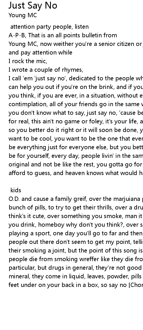 Just say no, do you hear me, say no just say no [Verse 2:] kids |