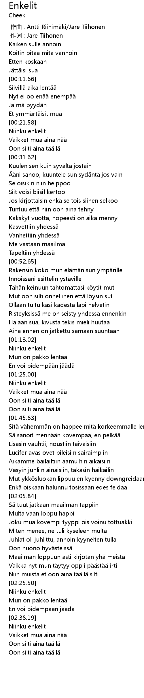 | [00:00.364] | 作词 : Jare Tiihonen |