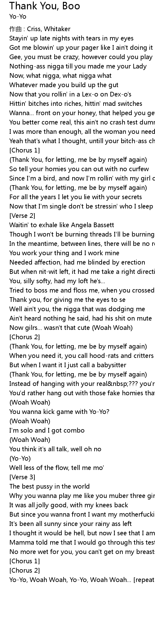 | Yo-Yo, Woah Woah, Yo-Yo, Woah Woah... [repeat till fade...] |