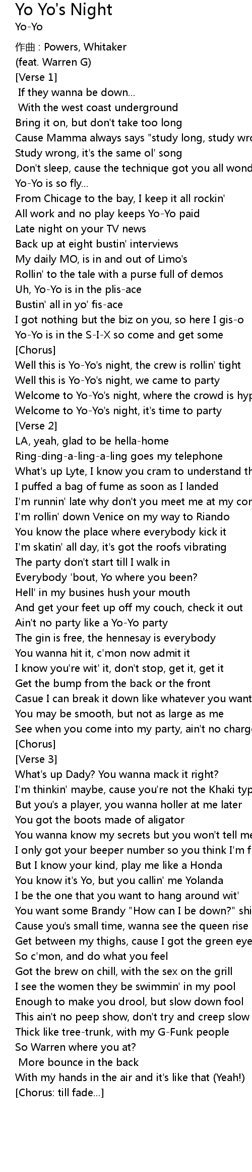 | Well this is Yo-Yo's night, the crew is rollin' tight | |