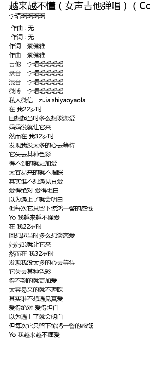 | Song | 越来越不懂(女声吉他弹唱)(Cover 蔡健雅) |