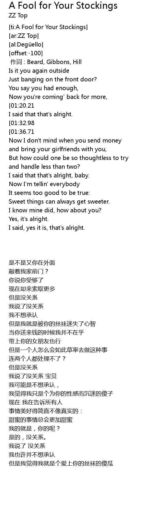 | [00:58.51][01:36.71][03:29.78] | I'm just a fool for your stockings I believe. |