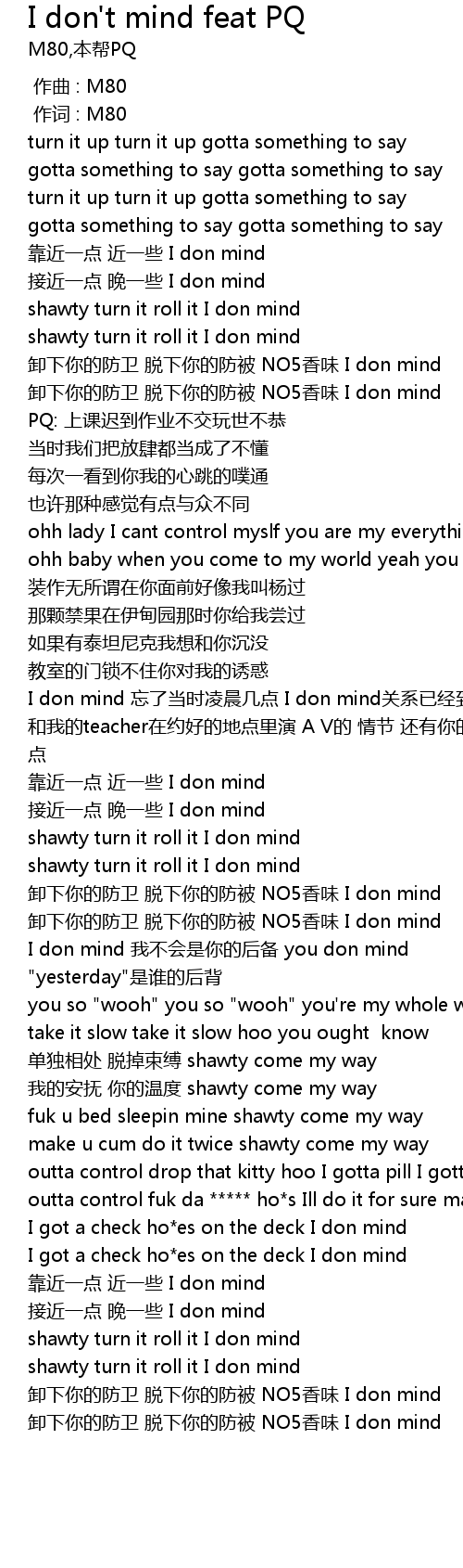 | [01:28.01] | I don mind wàng liǎo dàng shí líng chén jǐ diǎn I don mind guān xì yǐ jīng dào le jí xiàn |
