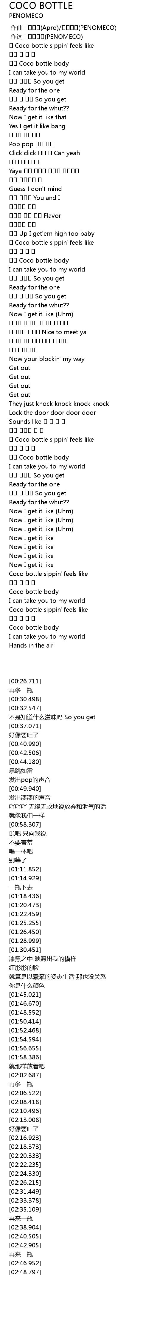 | [00:30.498] | 마치 Coco bottle body |