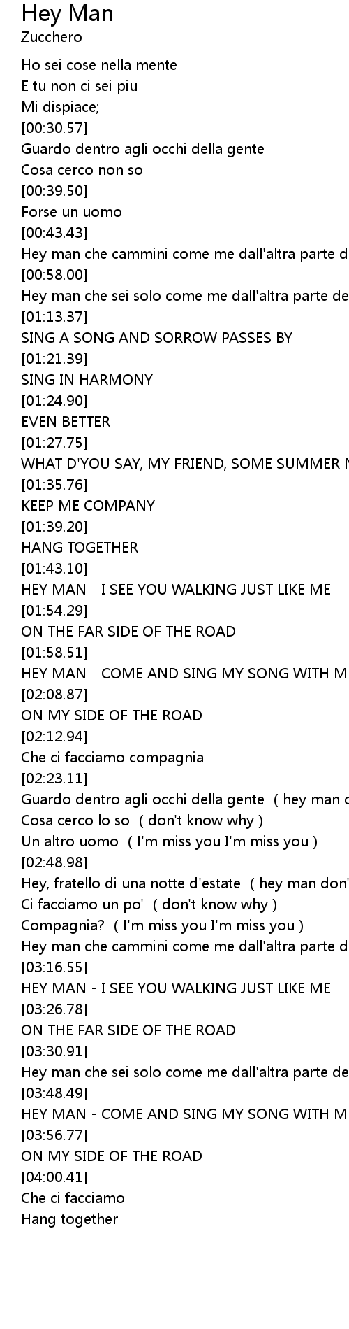 | [01:02.33] | Hey man che sei solo come me dall' altra parte della strada. |