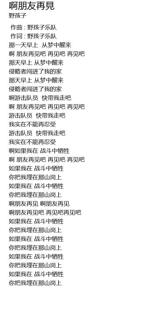 | [03:02.2] | 啊朋友再见吧 再见吧再见吧 |
