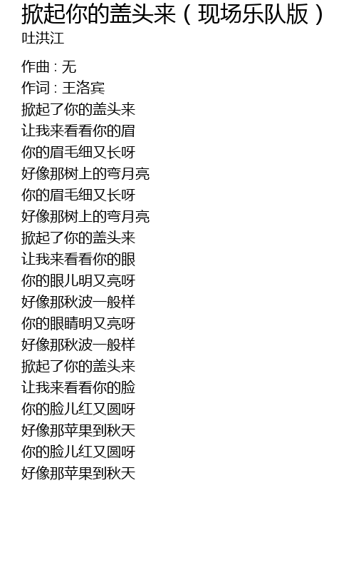 掀起你的盖头来(现场乐队版) xian qi ni de gai tou lai xian chang yue dui ban Lyrics