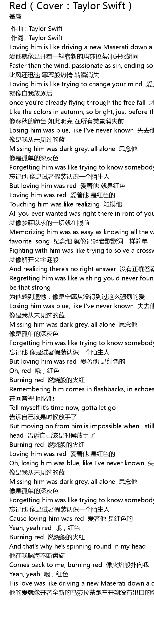 | [02:55.520] | Cause loving him was red 爱著他 是红色的 |