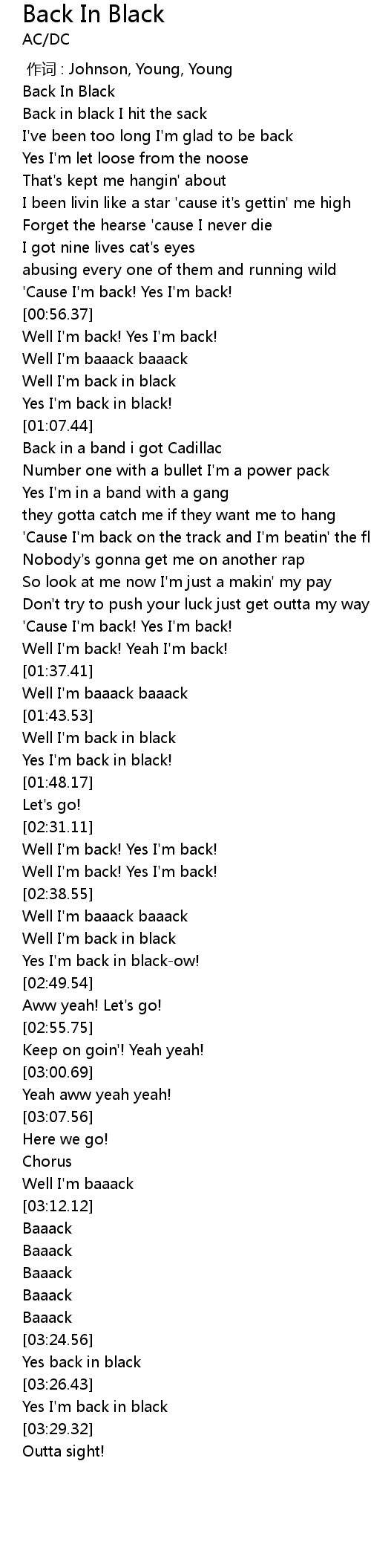 | [03:27.37] | Yes I'm back in black |