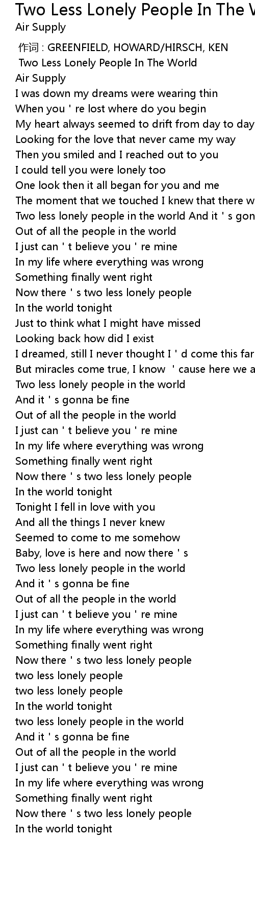 | [00:03.20] | Two Less Lonely People In The World |