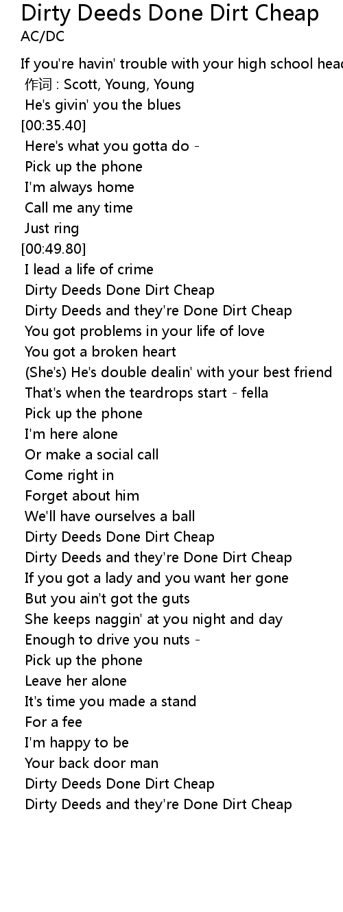 | [02:57.00] | Dirty Deeds Done Dirt Cheap |