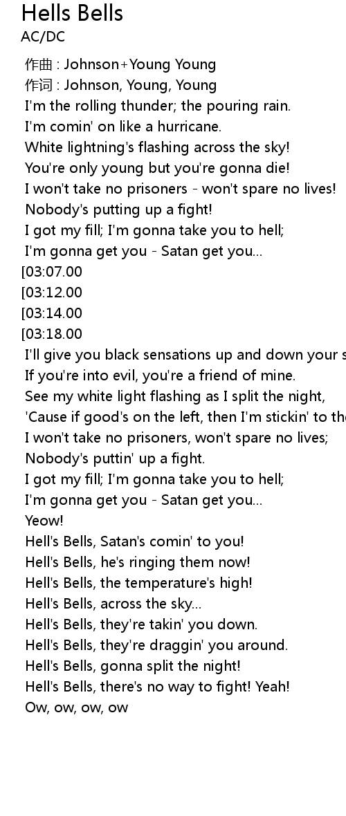 | [02:11.00][03:14.00] | You got me ringing Hell' s Bells! |