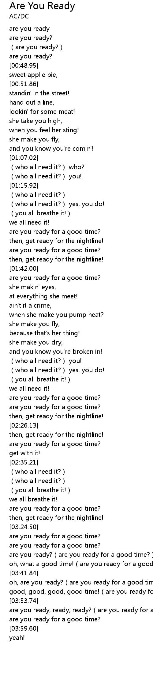 | [03:54.71] | are you ready, ready, ready? are you ready for a good time? |