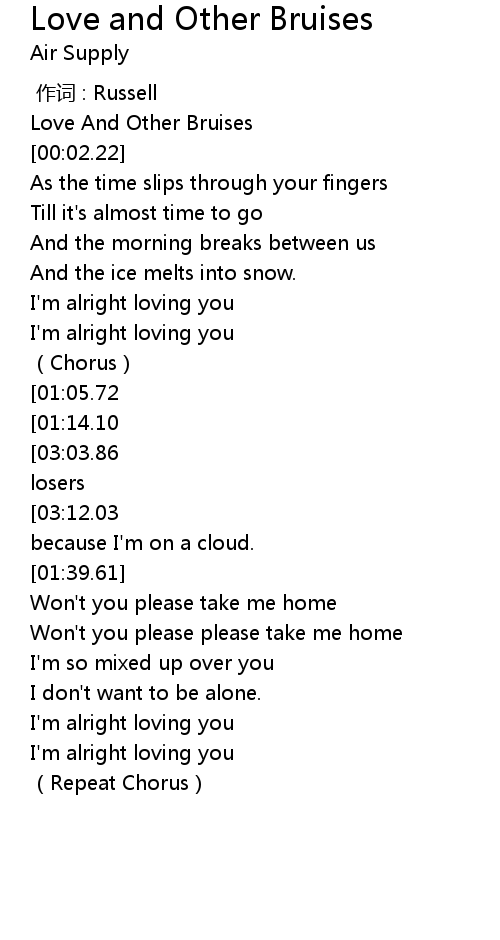 | [03:19.06][03:03.86][02:47.65][01:22.14] | Love and other bruises makes us all good losers |
