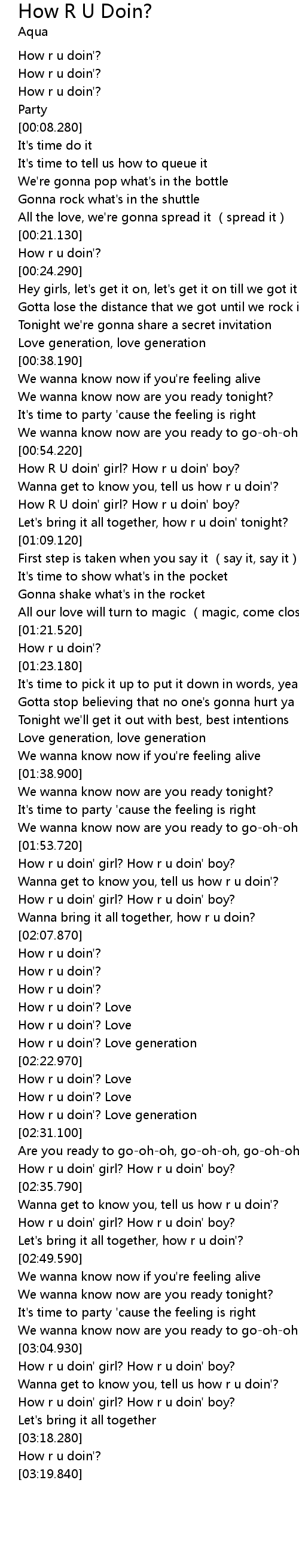 | [03:12.560] | How r u doin' girl? How r u doin' boy? |