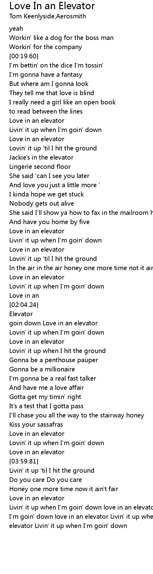 Livin' it up when I'm goin' down love in an elevator Livin' it up when I'm goin' down love in an elevator Livin' it up when I'm goin' down love in an elevator Livin' it up when I'm goin' down |
