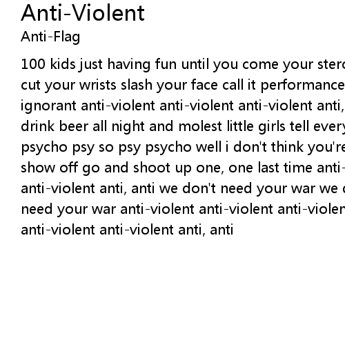 100 kids just having fun until you come your steroid arms and skinny head you cut your wrists slash your face call it performance art trying to be cool you're ignorant anti-violent anti-violent anti-violent anti, anti you start a fight drink beer all night and molest little girls tell everyone there that you're psycho psy so psy psycho well i don't think you're psycho you're just another show off go and shoot up one, one last time anti-violent anti-violent anti-violent anti, anti we don't need your war we don't need your war we don't need your war anti-violent anti-violent anti-violent anti, anti anti-violent anti-violent anti-violent anti, anti |