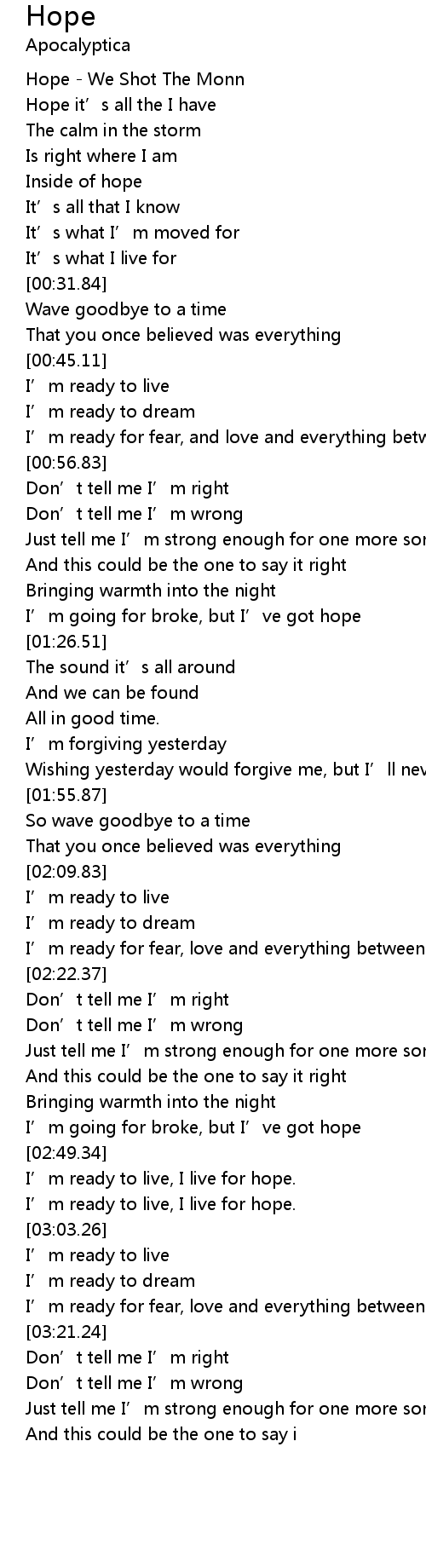| [02:57.48] | I’m ready to live, I live for hope. |
