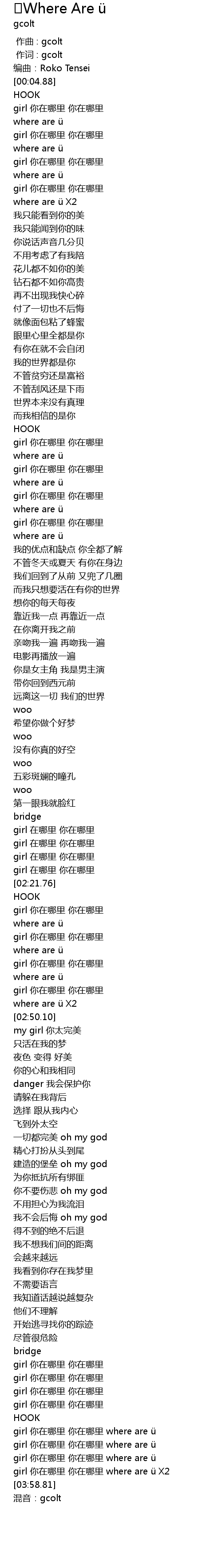 | [03:57.81] | girl nǐ zài nǎ lǐ nǐ zài nǎ lǐ where are ü X2 |