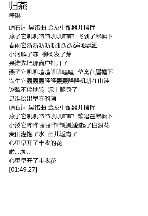 | [00:35.39] | 燕子它叽叽喳喳叽叽喳喳 垒窝在屋檐下 |