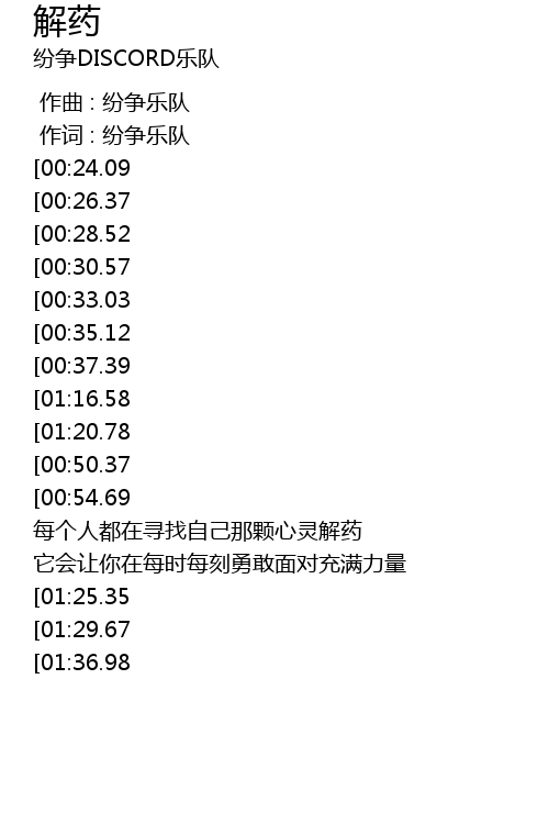 | [01:51.38][01:16.58][00:41.91] | 每个人都在寻找自己那颗心灵解药 |