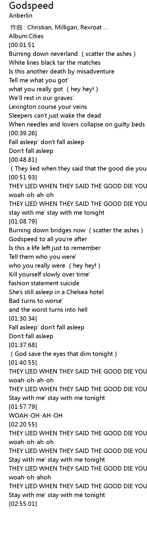 | [00:59.99] | THEY LIED WHEN THEY SAID THE GOOD DIE YOUNG! |