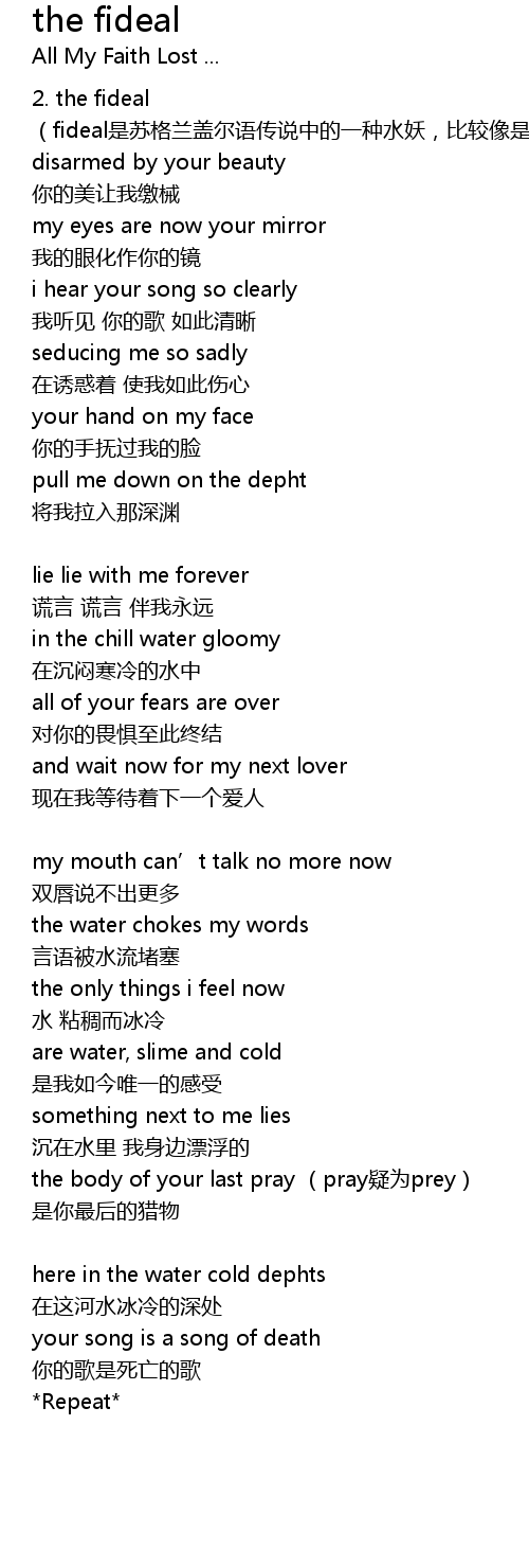 | (fideal是苏格兰盖尔语传说中的一种水妖,比较像是塞壬那种,用歌声诱惑人爱上她,后将其拖入湖中淹死) | |