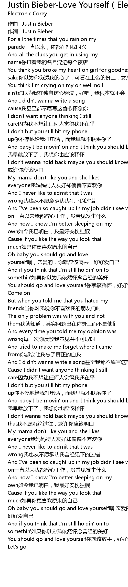 | [2:58] | Oh baby you should go and love yourself ō qīn ài de nǐ jiù yīng gāi lí qù hǎo hǎo ài zì jǐ |