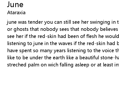 june was tender you can still see her swinging in the moon-scythe like spirits or ghosts that nobody sees that nobody believes in june was tender you can still see her if the red-skin had been of flesh he wouldn't have spent so many years listening to june in the waves if the red-skin had been of flesh he wouldn't have spent so many years listening to the voice that there wasn't june would like to be under the earth like a beautiful stone-hand white open with the streched palm on wich falling asleep or at least intimately thinking |