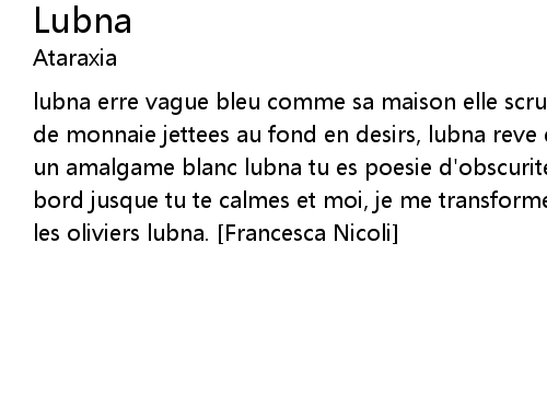 | lubna erre vague bleu comme sa maison elle scrute les pupilles comme des pieces de monnaie jettees au fond en desirs, lubna reve de pouvoir se dissoudre entre un amalgame blanc lubna tu es poesie d'obscurite ainsi je m'asseois dans ton bord jusque tu te calmes et moi, je me transforme en balancoire de bambou dans les oliviers lubna. [Francesca Nicoli] |