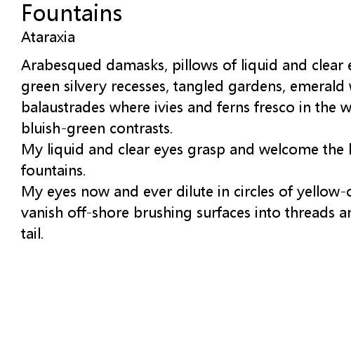 | Arabesqued damasks, pillows of liquid and clear eyes shining intense mirrors of green silvery recesses, tangled gardens, emerald water-works, old crumbled balaustrades where ivies and ferns fresco in the wind spiritual thrills of bluish-green contrasts. | |
