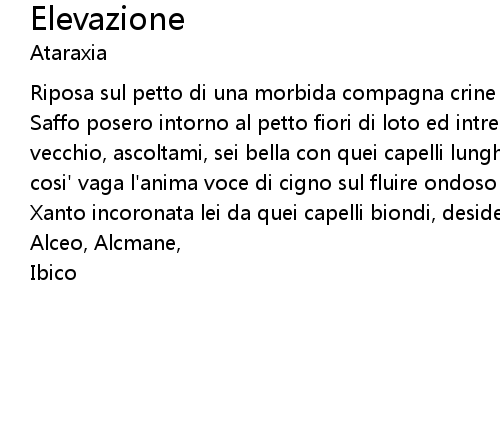 | Saffo posero intorno al petto fiori di loto ed intrecci di collane io sono vecchio, ascoltami, sei bella con quei capelli lunghi e quella veste d'oro hai cosi' vaga l'anima voce di cigno sul fluire ondoso dello | |