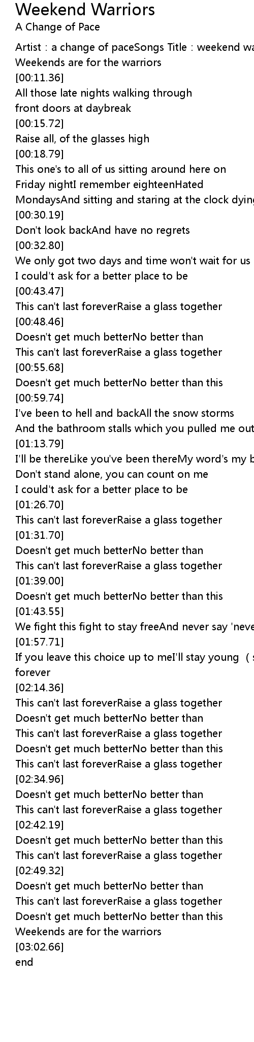 | [00:00.06] | Artist: a change of paceSongs Title: weekend warriors |