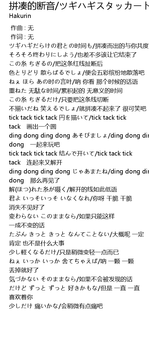 | [00:35.992] | tick tack tick tack 结んで开いて/tick tack tick tack 连起来又解开 |