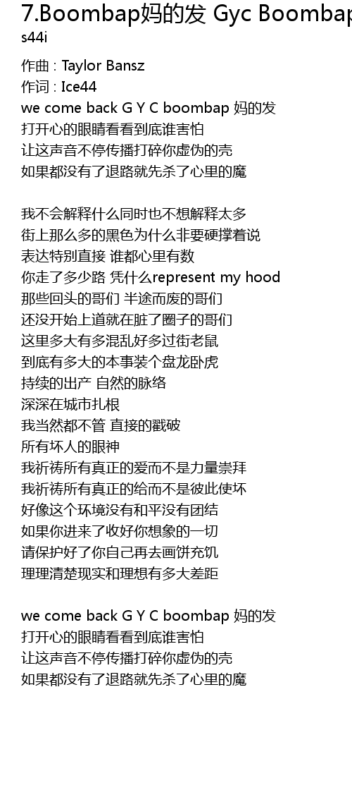 | Song | 7.Boombap妈的发 Gyc Boombap MTF(Prod by Taylor Bansz) |