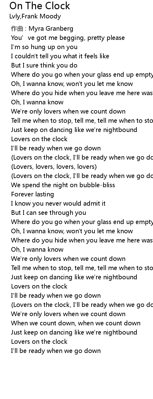 | [01:05.903] | (Lovers on the clock, I'll be ready when we go down) |