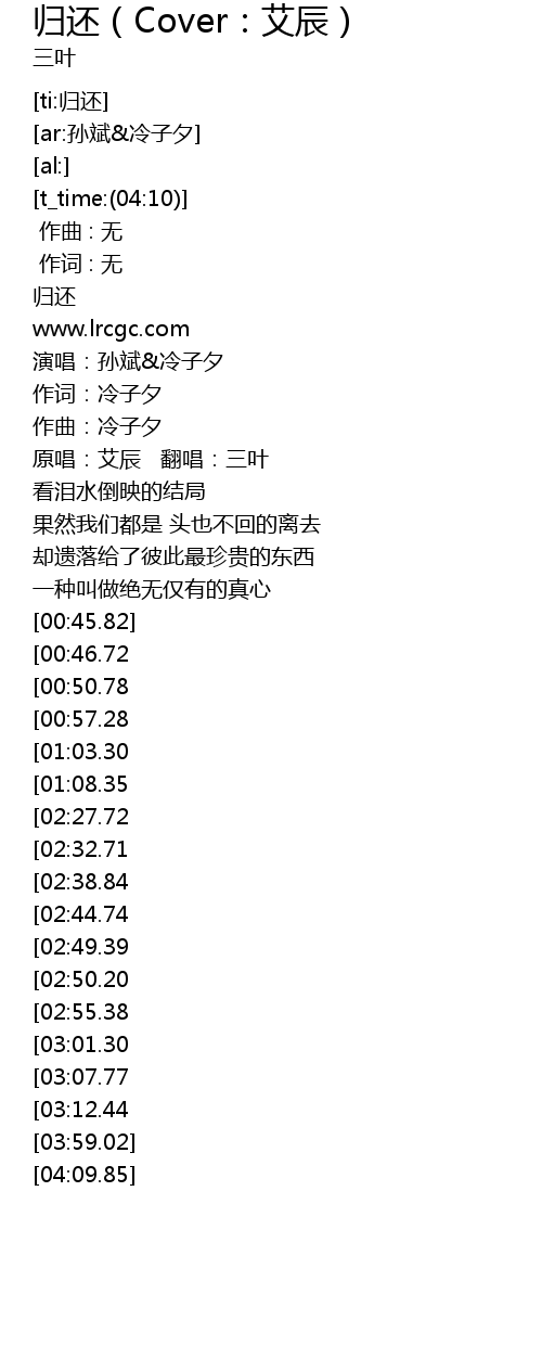 | [03:46.62][03:01.30][01:42.30] | 归还关心和温热 归还争吵和冷漠 |