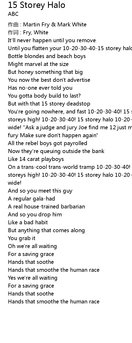 | You' re going nowhere, and fast 10203040! 15 storey halo! 10203040! 15 storeys high! 10203040! 15 storey halo 10203040? 7 miles wide 7 miles wide! " Ask a judge and jury Joe find me 12 just men We' re gonna bottle up their fury Make sure don' t happen again" | |