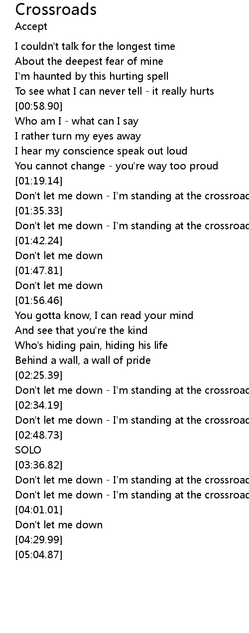 | [02:42.05] | Don't let me down - I'm standing at the crossroads |