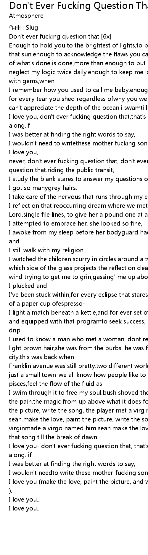 | I love you faded never, don' t ever fucking question that, don' t ever fucking question that. riding the public transit, | |