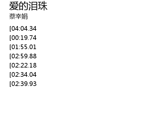 | [02:47.33][01:55.01][00:32.42] | zuo ye wo sa xia le lei zhu jiu xiang na chuan chuan zhen zhu |