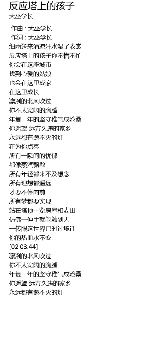 | [00:10.40] | 反应塔上的孩子你不慌不忙 |