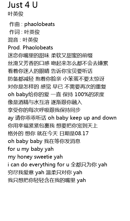 | [00:34.490] | oh baby gěi nǐ de ài yī zhí bǎo chí 100 de nóng dù |