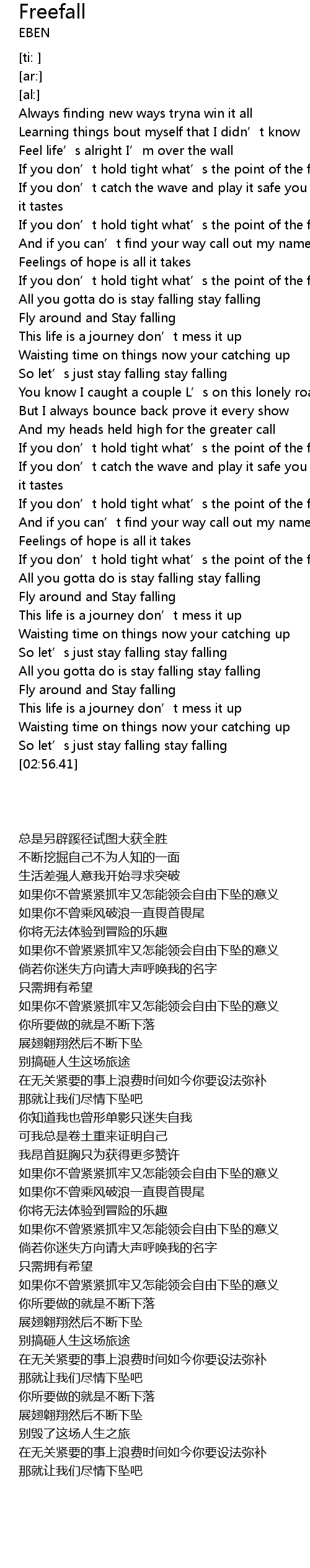 | [00:53.50] | If you don’t hold tight what’s the point of the freefall |