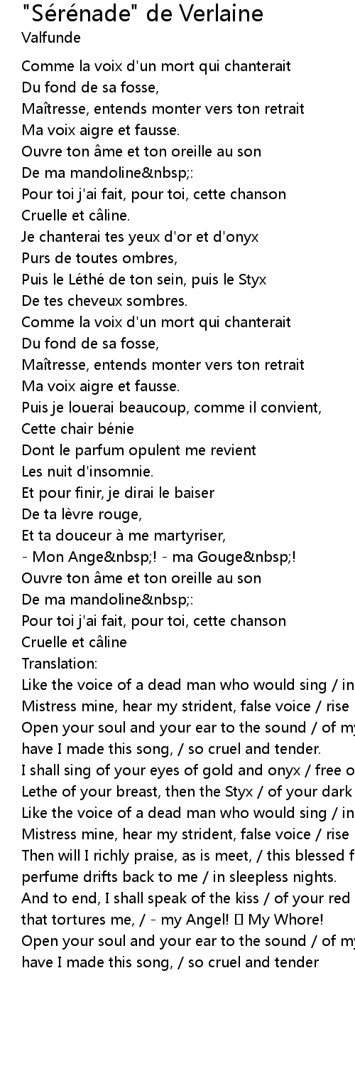 | Open your soul and your ear to the sound / of my mandolin: / for you, for you have I made this song, / so cruel and tender |