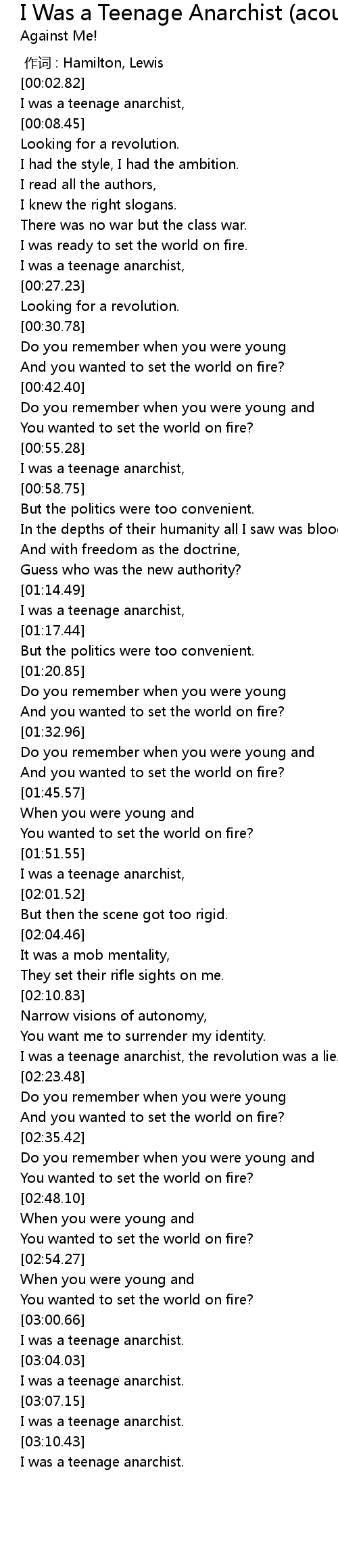 | [02:17.91] | I was a teenage anarchist, the revolution was a lie. |
