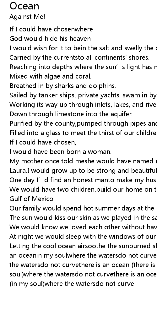 | Letting the cool ocean airsoothe the sunburned shouldersof our children.there is an oceanin my soulwhere the watersdo not curvethere is an oceanin my soulwhere the watersdo not curvethere is an ocean (there is an ocean)in my soul (in my soul)where the watersdo not curvethere is an ocean (there is an ocean)in my soul (in my soul)where the watersdo not curve |