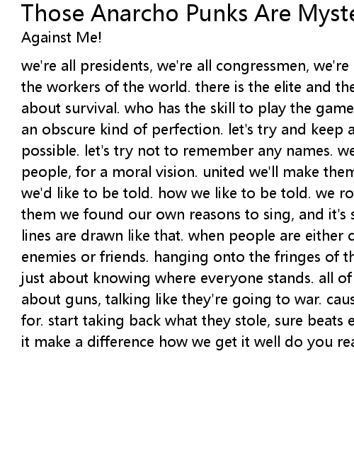 we're all presidents, we're all congressmen, we're all cops in waiting, we are the workers of the world. there is the elite and the dispossessed. it's only about survival. who has the skill to play the game for all it's worth, and reach an obscure kind of perfection. let's try and keep as much emotion out of this as possible. let's try not to remember any names. we'll do it for a country, for a people, for a moral vision. united we'll make them remember our history. or how we'd like to be told. how we like to be told. we rock, because it's us against them we found our own reasons to sing, and it's so much less confusing when lines are drawn like that. when people are either consumers or revolutionaries, enemies or friends. hanging onto the fringes of the cogs in the system. it's just about knowing where everyone stands. all of the sudden people start talking about guns, talking like they're going to war. cause they found something to die for. start taking back what they stole, sure beats every other option. but does it make a difference how we get it well do you really fucking get it |