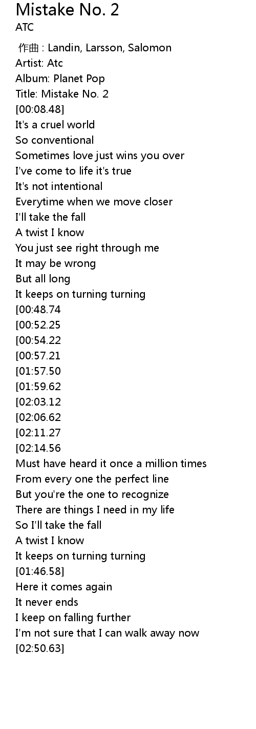 | [03:05.38][02:06.62][01:07.44] | Mistake no. 2 |