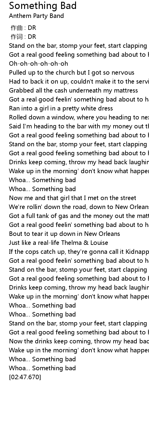 | [01:44.033] | Got a real good feelin' something bad about to happen |